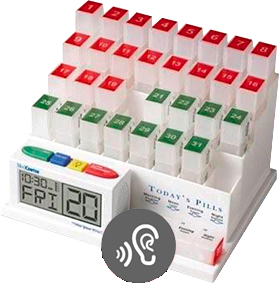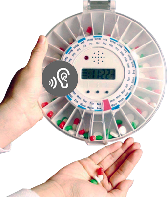 Alarm sounds when it's time for medication to be taken. The clock can also beep and talk, saying, "Please take your pills." - Additional Information: